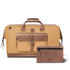 Une pochette de rangement souple glissée dans un sac de voyage en cuir permet de garder à portée de main les objets essentiels (écouteurs, tablette, carnet de notes).