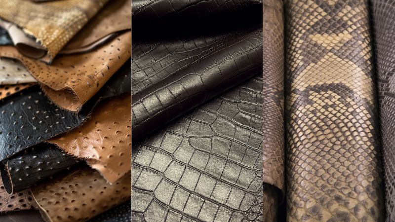 Les cuirs exotiques occupent une place à part dans la maroquinerie haut de gamme. Provenant d’animaux tels que le crocodile, le serpent, l’autruche ou encore le poisson, ils se caractérisent par des textures singulières et une forte valeur perçue.