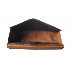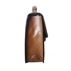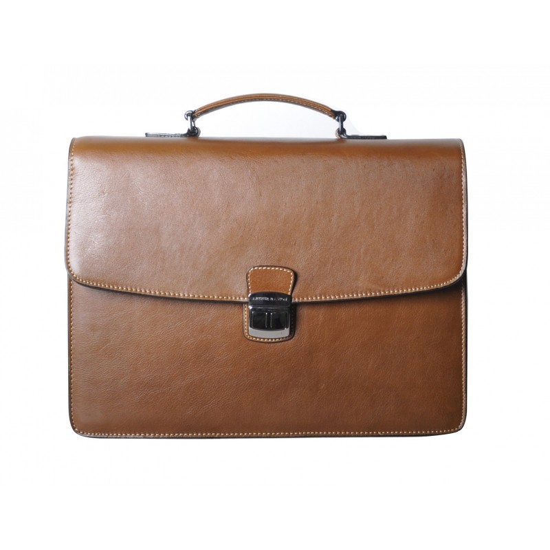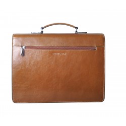Serviette 1 soufflet en cuir vachette, munie d'une poignée rigide. Rabat à fermoir tuck, un compartiment, poche plate et emplacements stylos. Poche zippée au dos. Housse de rangement livrée.