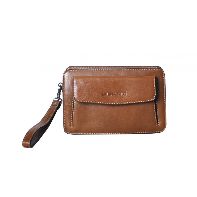 Equipé d'une dragonne, cette pochette en cuir huilé Arthur & Aston a un côté qualité et authentique relevé par le logo de la marque.